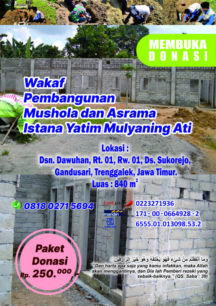 Yayasan Mulyaning Ati sedang memulai pembangunan Panti Asuhan yang selanjutnya kami beri nama “Istana Yatim Mulyaning Ati”, dengan tujuan untuk dapat memberikan pengayoman yang memenuhi kecukupan kwalitas dan kwantitasnya sehingga seluruh penghuni panti asuhan dapat tinggal dengan layak.